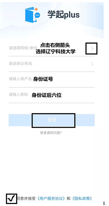 2、進入app后,選擇遼寧科技大學,輸入用戶名、密碼,并同意政策