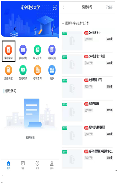 3、選擇課程學習,進入課程界面,2021秋為本學期要學習的課程。