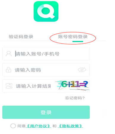 2、選擇賬號密碼登錄(注意第一次登陸必須用賬號密碼登錄,登錄后綁定手機(jī)號,綁 定手機(jī)號之后可以選擇驗證碼登錄)