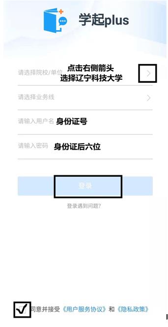 2、進(jìn)入app后,選擇遼寧科技大學(xué),輸入用戶名、密碼,并同意政策