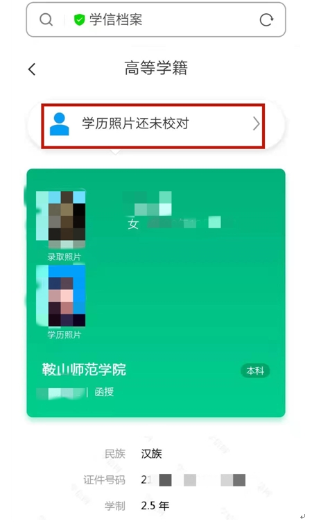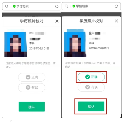 6、如無誤,請在學歷照片處點擊確認,然后告知自己的班主任,已完成圖像校對。如有誤,請第一時間聯系自己的班主任。